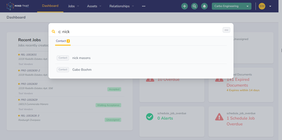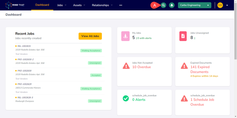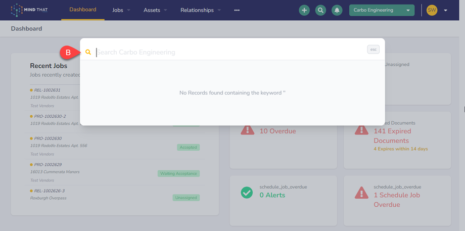 You can use the Global Search feature in the Mind That dashboard by (a) clicking on the Search Icon found on the Main Navigation bar beside the “+” Icon and the Bell notification.