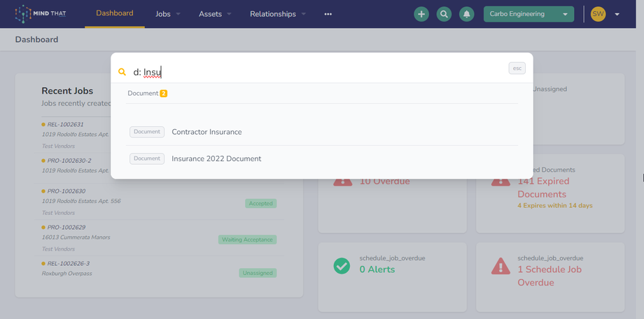 To search for Documents using Global Search, you can type in “Documents” followed by a colon or by typing in the first letter followed by a colon. The query should look like documents:[keyword] or d:[keyword]. See the above images for reference.