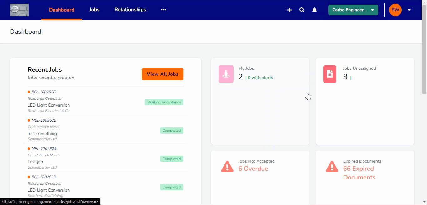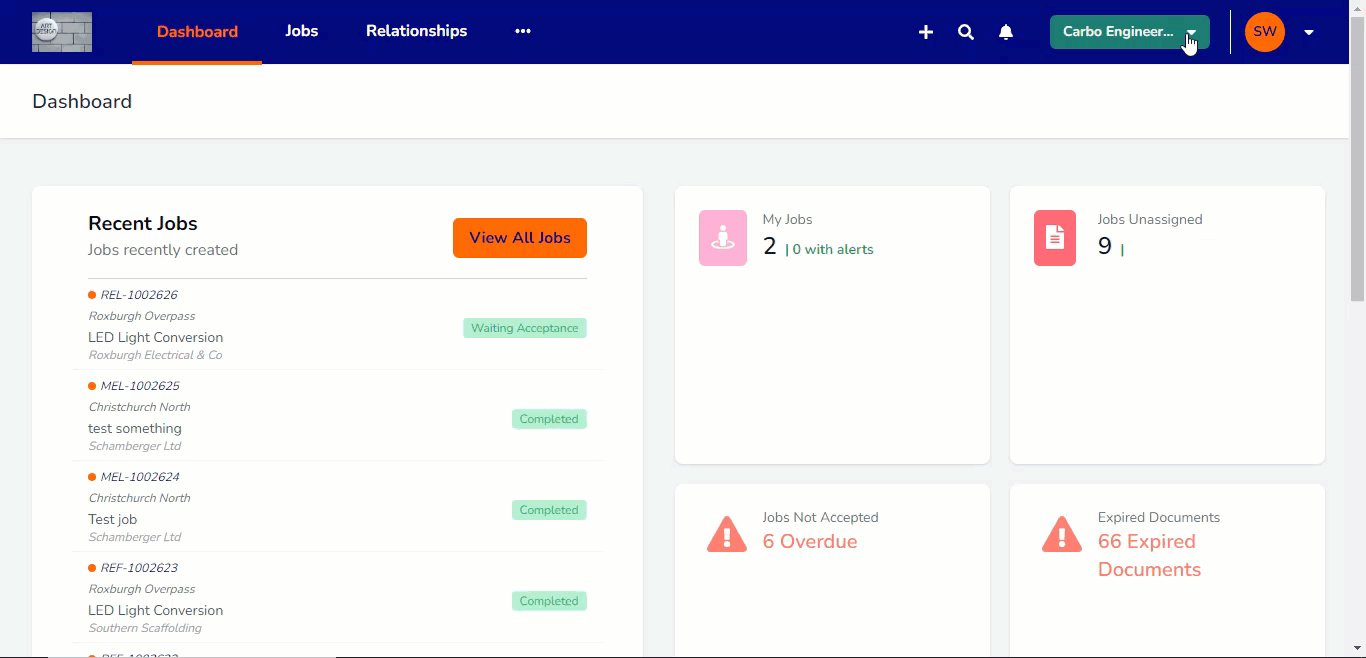 Move your cursor to the Company profile beside the Individual profile and notification bell on the main navigation bar. Click the company profile dropdown button, and a menu will appear.