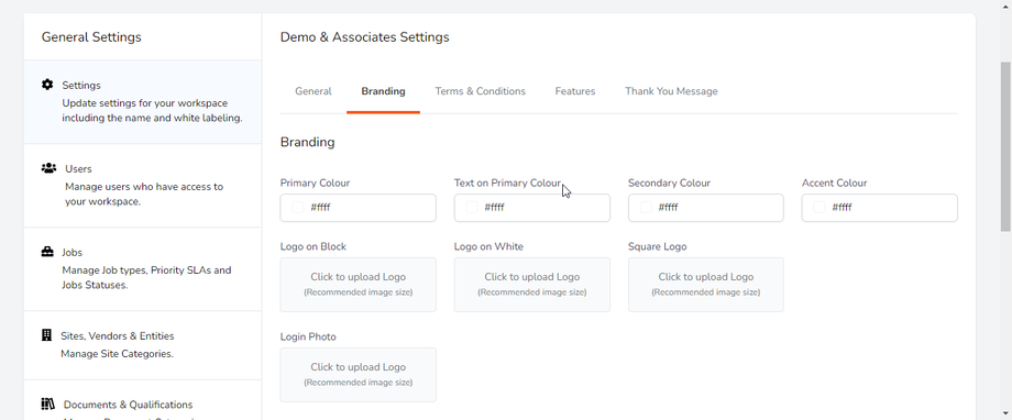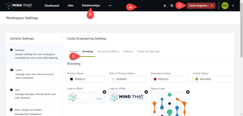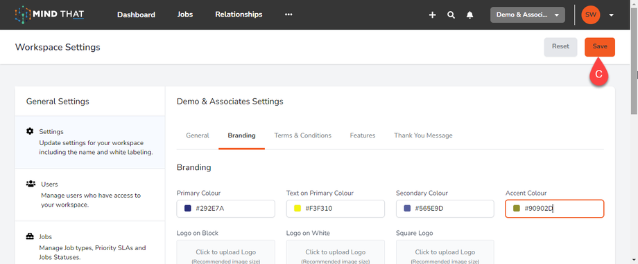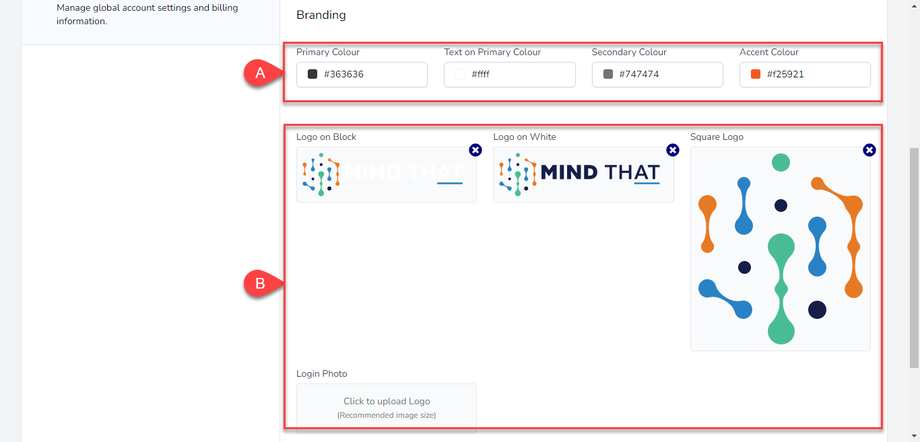 In the branding tab, you can modify the appearance of your workspace. Please note that this feature only allows you to customise colours, images, and logos and does not affect any other aspects of your Mind That account.