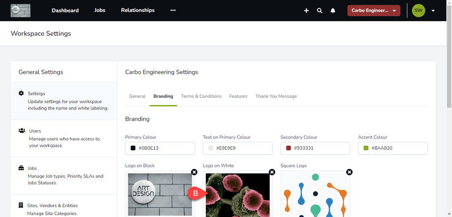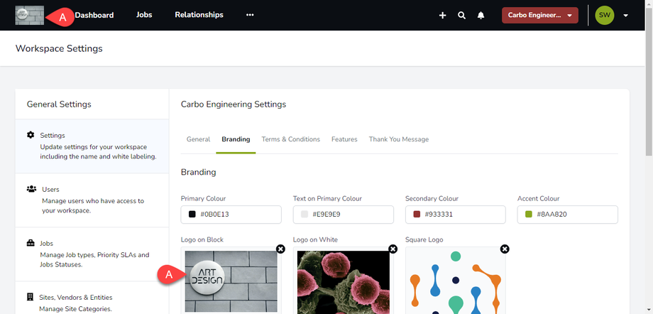 To begin, (a) you can change the primary, secondary and accent colour of your workspace using an RGB and HEX colour picker which you can access by clicking on the designated label field.