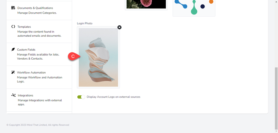 You can also (c) change the login photo. Ensure the “Display Account Logo” button is toggled on to show the image.