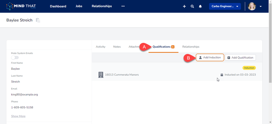 Look for the (a) Qualifications Tab and click. Click the (b) “Add Induction” button and a new dialogue box will appear.