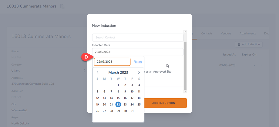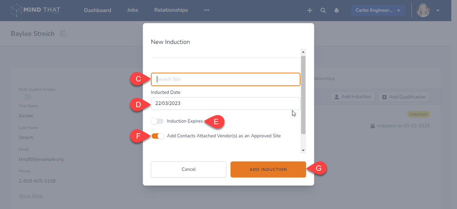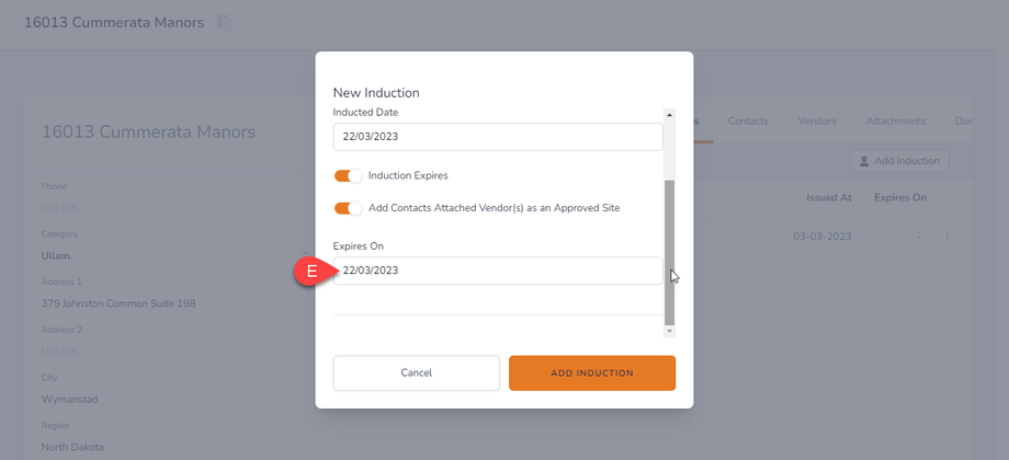 Next, indicate (d) when the induction date is for the contractor. Toggle on (e) the “Induction Expires” button if the induction has an expiration; otherwise, leave it as is.