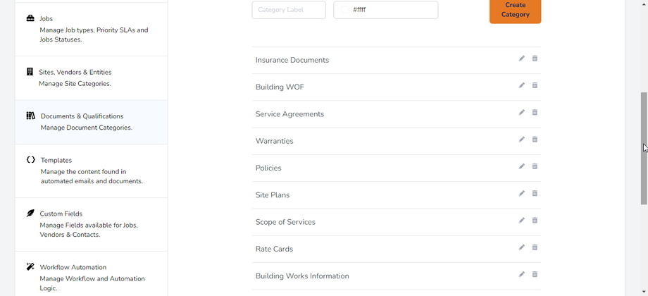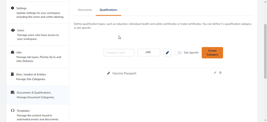 Under General Settings are several customisation options you can choose from and change according to your company’s preference. The options include Settings, Users, Jobs, Sites, Vendors and Entities, and more. We’re going to focus on the Documents and Qualifications section.