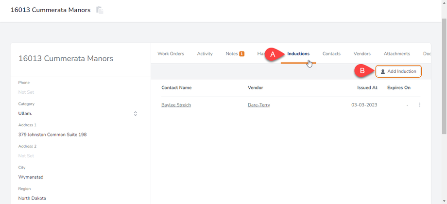 Click (a) on the Inductions Tab. Click the (b) “Add Induction” button, as shown in the image above.