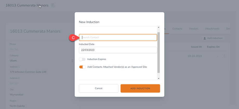 The first text field (c) will prompt you to type in the site where you want to induct the contact.