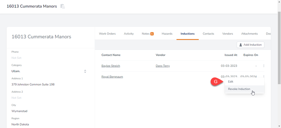 Once you’ve added the contacts, you’ll see them on the list in the image above. When clicking the kebab menu, two options will appear: Edit and Revoke Induction. You can (g) revoke the induction of a contractor if the contract is already done or has expired.
