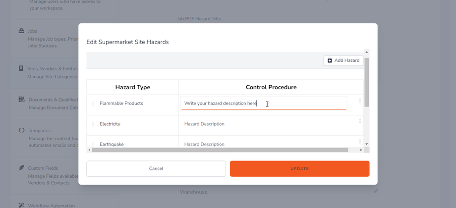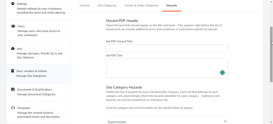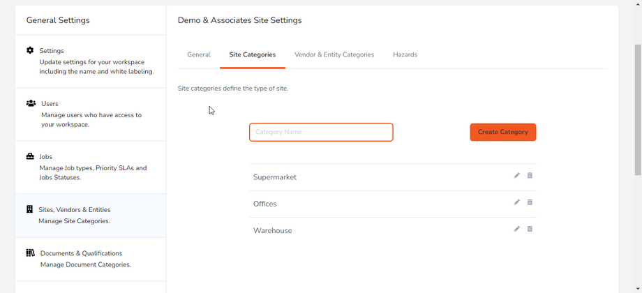 The Site Categories tab defines the types of sites in your workspace. In this example, we’re a supermarket company. Our sites may include the Supermarket itself, warehouses and office buildings. These sites have different hazards and inductions, which we’ll discuss further in a separate tutorial.