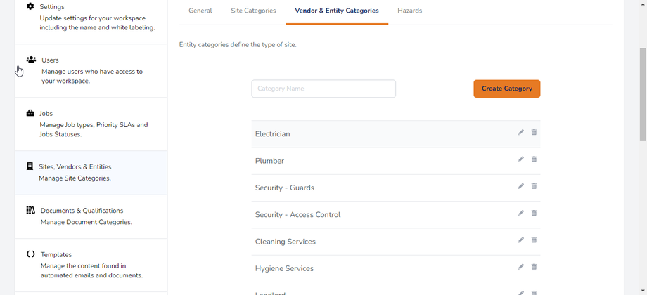 Similar to the Sites Categories, this tab also defines the type of site, but instead of physical locations, it deals with relevant individuals. You can list down the vendors and entities that can do a particular work order or job. Examples in the image include Electricians, Plumbers, Aircon specialists, etc.